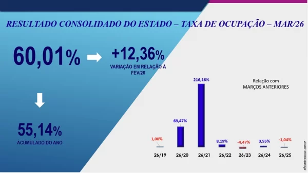 TO de março/26: 60,01%. Variação positiva em relação a fevereiro/26: 12,36%. Acumulado do ano: 55,14%.