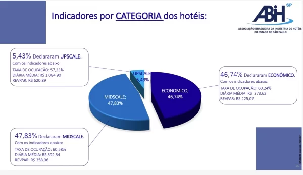 Nesta edição, a ABIH-SP apresenta também os indicadores de categoria (Econômico, Midscale e Upscale) e de posicionamento principal do hotel (Corporativo, Lazer ou Ambas Opções). Ambos com altas e baixas, de acordo com as respostas tabuladas. Estas informações são relevantes para análise do desempenho dos hotéis por categoria e atividade principal.