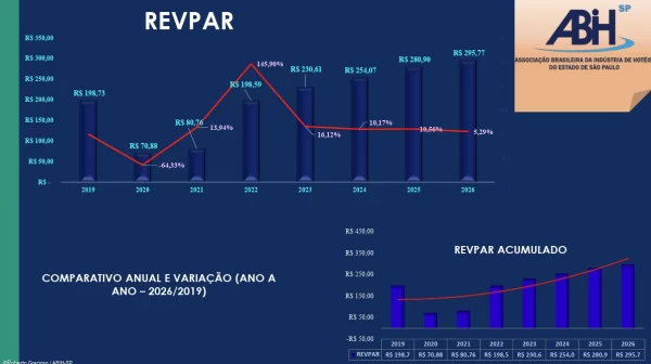 Em comparação com o mesmo período de 2025, somente a TO foi menor em quase 1%. A DM foi superior em 7,67% e o RevPar 6,55%. O RevPar apresentou o segundo maior índice histórico, desde o início da série. A performance dos hotéis de lazer foi satisfatória e os hotéis corporativos retomaram o movimento, como esperado.