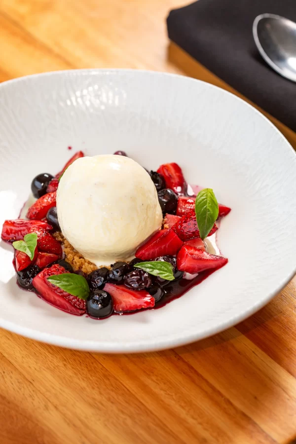 Entre as entradas, o menu apresenta Burrata cremosa com chutney de figo, jamon fatiado e rúcula ou Ceviche de palmito pupunha com caju, cebola roxa, castanha do Pará e coentro. Nos pratos principais, o cliente pode escolher entre Robalo grelhado com aspargos cremoso e caviar, e Salmão grelhado com beurre blanc de maracujá e couscous marroquino com mix de quinoa, além da opção vegetariana que reforça a diversidade do percurso. Para finalizar, as sobremesas incluem Frutas vermelhas assadas com sorvete de baunilha e manjericão ou Chocolate branco com mel de maracujá e crumble.