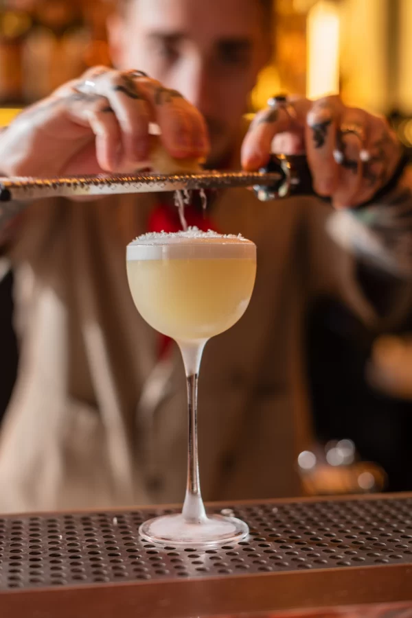 No Parmigiano Sour, a técnica atua diretamente na percepção sensorial. A aquafaba substitui a clara de ovo como agente emulsificante, criando uma espuma estável, enquanto o Parmigiano Reggiano ralado adiciona glutamato natural, responsável pela sensação de umami. “Esse diálogo entre acidez, doçura, salinidade e gordura faz com que o coquetel evolua na boca, lembrando mais um prato do que um coquetel tradicional”, conta o bartender.