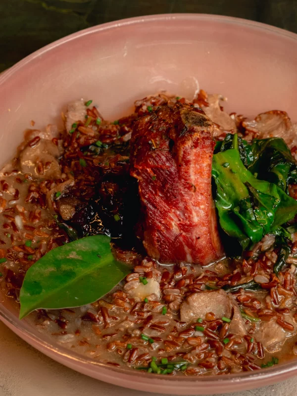 Arroz caldoso com bochecha de porco, costelinha defumada, ora-pro-nóbis e bacon caramelado
