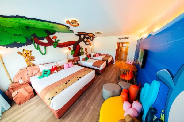 Agora, esse universo passa a fazer parte da hospedagem de forma ainda mais concreta na Costa do Sauípe. O Sol Grand Premium passa a contar com 14 suítes temáticas da Turminha da Zooeira, com cerca de 41 m², projetadas para receber até quatro pessoas e com possibilidade de conjugação entre unidades, ampliando a capacidade para famílias maiores. A proposta é que os quartos funcionem como uma extensão da narrativa que as crianças já encontram em outros pontos de contato com a marca, aprofundando a experiência dentro do próprio hotel e reforçando a sensação de que a viagem começa a ganhar contornos lúdicos antes mesmo de qualquer programação especial.