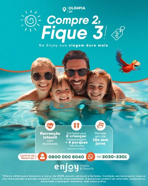 As ofertas contemplam os dois empreendimentos da rede em Olímpia: o Enjoy Olímpia Park, ideal para quem busca estar no centro da diversão, e o Enjoy Solar das Águas, reconhecido pela amplitude de suas suítes e áreas de lazer silenciosas. É importante ressaltar que as condições são válidas especificamente para os meses de fevereiro e março de 2026, exceto no período de Carnaval (de 12 a 20/02) e feriados.