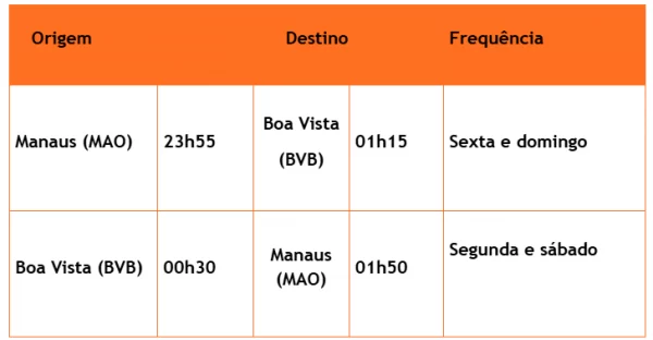 A ligação entre as capitais amazonense e roraimense ocorre com frequências semanais específicas, permitindo maior agilidade no deslocamento. As partidas de Manaus acontecem às sextas e domingos, enquanto os voos de retorno saindo de Boa Vista ocorrem às segundas e sábados. (confira as frequências abaixo).