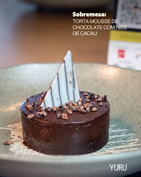 Gâteau Mousse de Chocolate com Nibs de Cacau: torta mousse de textura aerada, finalizada com a intensidade e crocância dos nibs de chocolate.