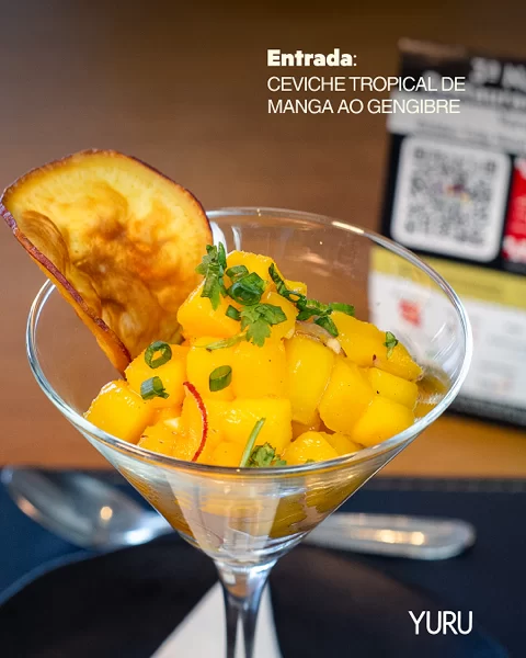 Ceviche Tropical de Manga ao Gengibre: cubos refrescantes de manga marinados com gengibre e pimenta suave, finalizados com cebola roxa, coentro e um fio de azeite extravirgem.