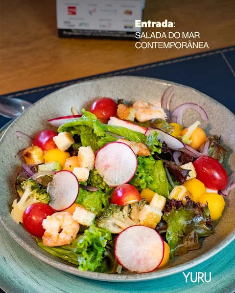 Salada do Mar Contemporânea: mix de folhas nobres com camarões grelhados e kani kama, acompanhado de tomatinho, rabanete, crótons artesanais, melão, manga e brócolis ao molho refrescante da casa.