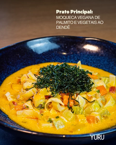 Moqueca Vegana de Palmito e Vegetais ao Dendê: cozido de palmito e legumes da estação em leite de coco artesanal, pimentões coloridos, cebola roxa e o toque tradicional do azeite de dendê e ervas frescas.
