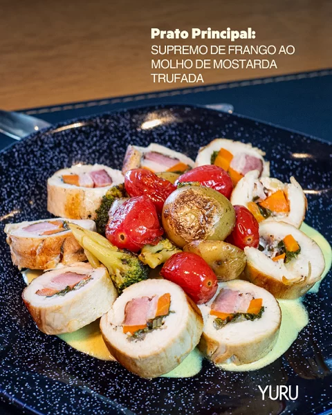 Supremo de Frango ao Molho de Mostarda Trufada: peito de frango ao rolê recheado com bacon, cenoura e muçarela, servido com batatas aperitivo, brócolis ao dente e tomates confitados ao perfume de trufas.