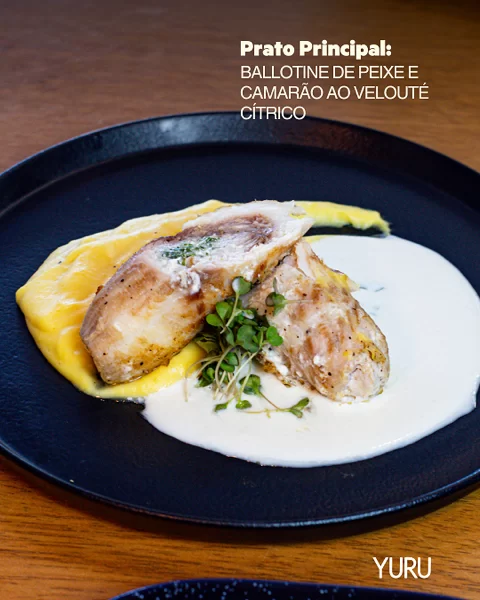 Ballotine de Peixe e Camarão ao Velouté Cítrico: peixe recheado com camarão selecionado e espinafre fresco, servido com um aveludado purê de mandioquinha e molho cítrico.