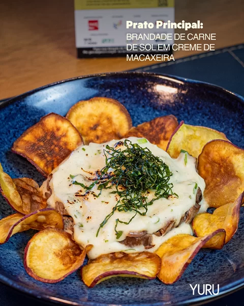 Brandade de Carne de Sol em Creme de Macaxeira: finos cubos de carne de sol envolvidos em um creme suave de macaxeira, requeijão e leite de coco, finalizados com a crocância de chips de batata-doce.