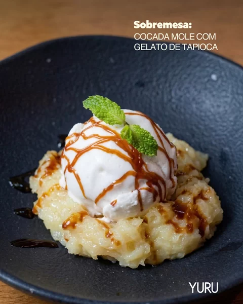 Cocada Mole com Gelato de Tapioca: cocada cremosa de coco fresco com toque de canela e leite condensado, servida com sorvete de tapioca e mel de engenho.