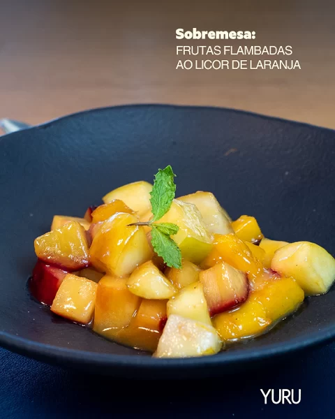 Frutas Flambadas ao Licor de Laranja: maçãs verde e vermelha, pera, manga e ameixa caramelizadas e flambadas em licor de laranja.