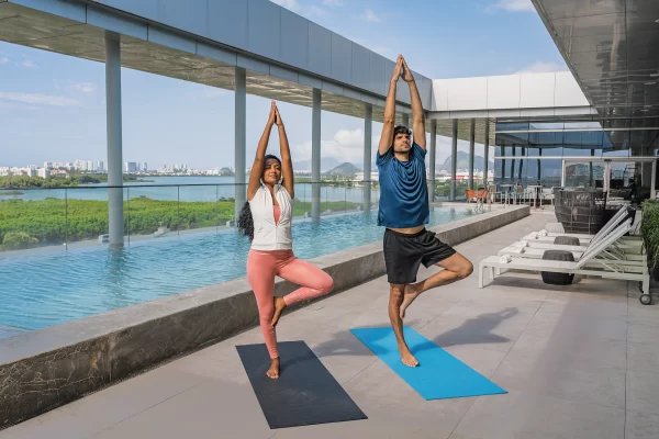 A atividade de yoga ao amanhecer, chamada de Experiência Bem-estar, acontece no domingo, dia 15 de março, às 5h da manhã, no 9º andar do hotel, com uma vista deslumbrante para a Barra da Tijuca que une a vegetação local, a lagoa de Jacarepaguá e a Pedra da Gávea. A aula inicia ao amanhecer, e os participantes são convidados a uma sessão de yoga com duração de duas horas, conduzida pelo professor Paulo Andrade, do estúdio Exhale. A aula será enriquecida com sound healing, uma terapia vibracional que utiliza sons e frequências específicas para promover a harmonização física, mental e espiritual. Após a revitalizante sessão, um café da manhã será servido no At Rio Rooftop & Lounge. Ambas as opções convidam a um retiro de tranquilidade, ideal para recarregar as energias, e reafirmam a proposta do hotel em combinar qualidade de vida e momentos de pausa em meio à rotina acelerada.