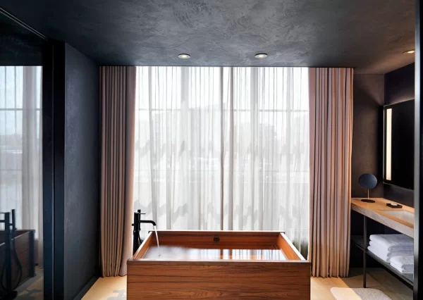 O hotel traduz essa essência em hospitalidade. Com 115 quartos e suítes, os ambientes unem o minimalismo japonês a referências industriais que dialogam com o passado do bairro. Madeiras nobres, tons sóbrios, linhas limpas e uma atmosfera serena transformam cada acomodação em um refúgio urbano.