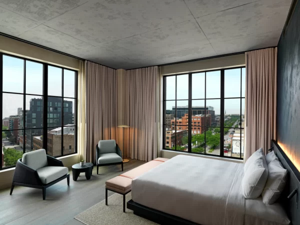 A experiência se completa com espaços dedicados ao bem-estar, como piscina aquecida, academia de última geração e áreas pensadas para equilibrar corpo e mente, uma pausa necessária em uma cidade tão dinâmica quanto Chicago.