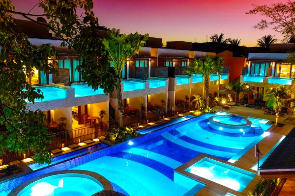 O hotel oferece infraestrutura completa, com três piscinas externas, incluindo a maior piscina com lateral de vidro da América do Sul, além de uma piscina coberta aquecida, hidromassagens, cachoeira artificial e cortina d’água. Ao todo, são mais de 720 m² de área aquática dedicados ao lazer e ao relaxamento.