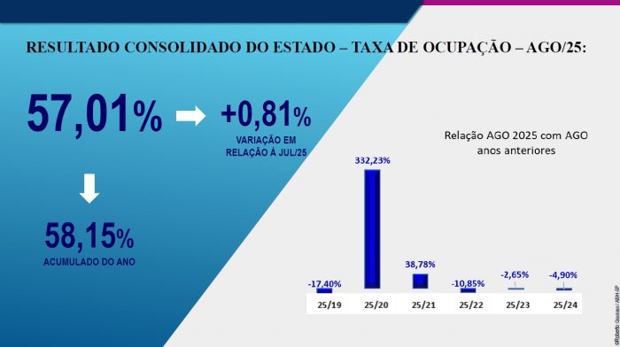 TO de agosto/25: 57,01%. Acumulado do ano: 58,15%. Variação em relação a julho: +0,81%.