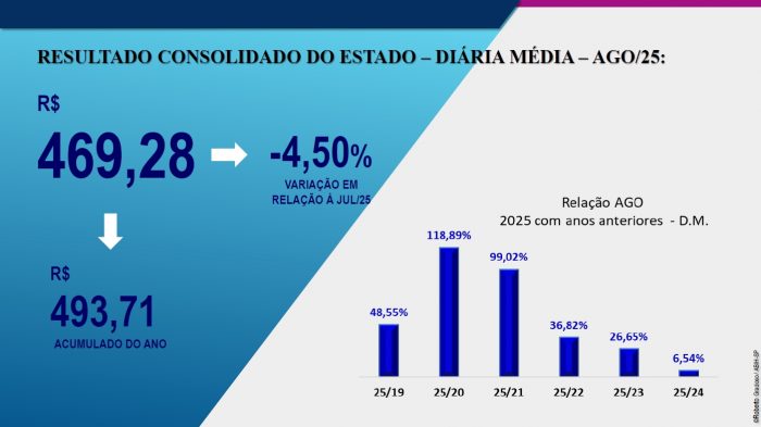 DM de agosto/25: R$ 469,28. Acumulado do ano: R$ 493,71. Variação em relação a julho:  4,50 %.
