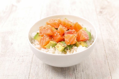 Em uma tigela, monte uma cama de arroz temperado, em seguida, uma camada de avocado e outra de salmão.