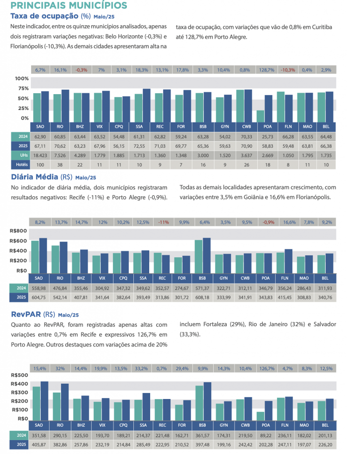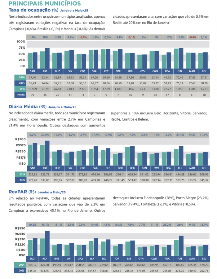 Na análise dos dados acumulados de janeiro a maio de 2025, o InFOHB considerou uma amostra de 581 hotéis de redes associadas, responsáveis por 95.437 unidades habitacionais (UHs). Em comparação com o mesmo período de 2024, foram registrados aumentos de 4,3% na taxa de ocupação, 11,2% na diária média e 15,9% no RevPAR.