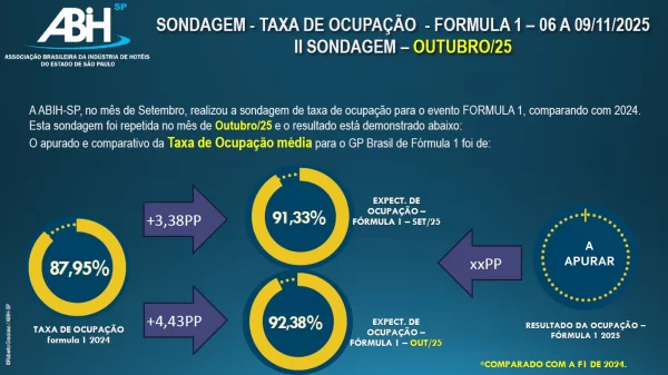 A Associação Brasileira da Indústria de Hotéis do Estado de São Paulo (ABIH-SP) divulga os resultados consolidados das sondagens referentes ao desempenho da hotelaria paulista em outubro de 2025, além das previsões atualizadas para o GP Brasil de Fórmula 1 e para o feriado da Consciência Negra.