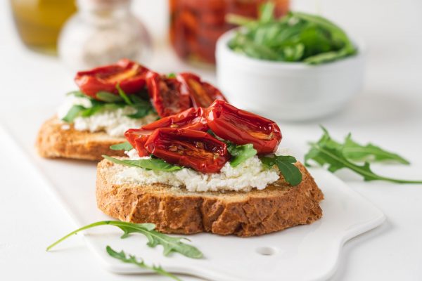 Espalhe o requeijão (ou cream cheese) nas fatias de pão. Coloque o queijo, o tomate seco e a rúcula por cima. Regue com um fio de azeite e tempere com sal e pimenta. Aqueça na sanduicheira, frigideira ou forno por 2–3 minutos até o queijo derreter levemente e o pão ficar crocante