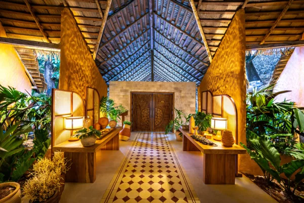 O teto suspenso — elemento icônico preservado na renovação — convive com portas talhadas artesanalmente e com o paisagismo que se mistura à arquitetura, reforçando a sensação de continuidade entre interior e exterior. Premiada, a renovação celebra a identidade e as referências da Bahia.