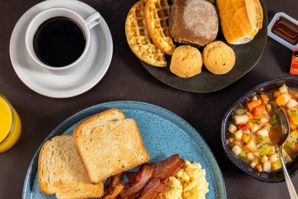 Servido diariamente, o café da manhã do hotel conta com um buffet completo que inclui seleção de frutas e frios, variedade de pães doces e salgados, bolos com cobertura à parte, iogurtes, cereais, ovos mexidos, pão de queijo e waffles, além de bebidas quentes e frias. Há ainda itens funcionais, veganos e com zero lactose.